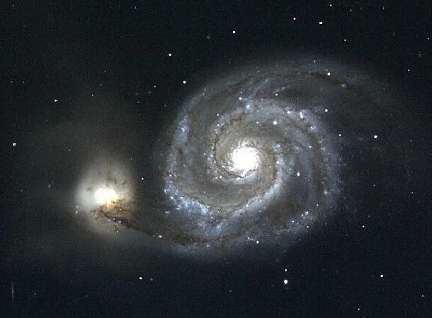 Галактика Водоворот, или Мессье 51, — один из самых известных и фотографируемых небесных объектов. Ее можно найти в созвездии Гончие Псы, на расстоянии 23 миллионов световых лет от Земли. Это первая галактика, у которой была обнаружена спиральная структура. Она выглядит совершенно фантастически. Кроме того, у нее есть галактика-компаньон — NGC 5195, и гравитационное взаимодействие между ними вызывает интенсивное звездообразование.
