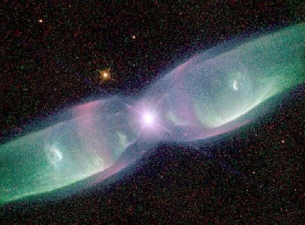 Лучистые «крылышки» на фотографии — это последний свет умирающей звезды после выброса ее внешних слоев. Астрономы обнаружили, что две звезды в туманности M2-9 имеют примерно такую же массу, как и Солнце. В то время как большая звезда приближается к концу своей жизни, ее меньший партнер — высокоразвитый белый карлик.