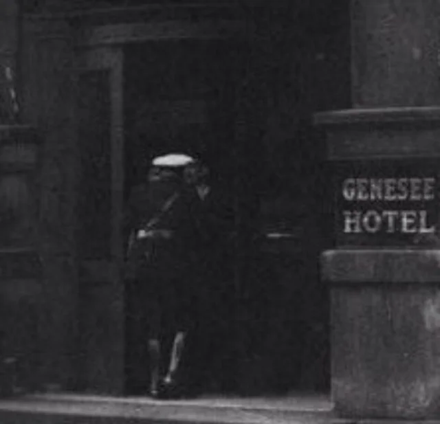 Вывеска, висящая на боковой стороне здания, рекламирует стоимость номеров в отеле Genesеe как «1 доллар США и выше» за ночь, а бутерброды в кофейне внизу стоили клиентам всего 10 центов в 1942 году. Отель Genesee был построен в 1882 году, но впоследствии это историческое здание было снесено.