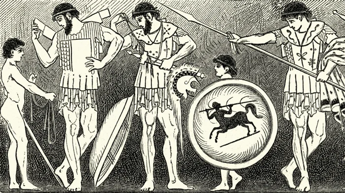 Богатый афинский гоплит с дорогим бронзовым щитом-гоплоном