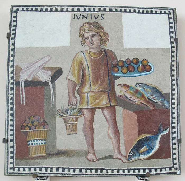 Мальчик раб на продуктовом рынке. Римская мозаика III века нашей эры