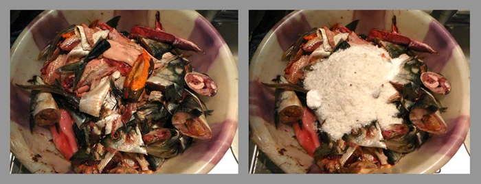 Готовился классический гарум так: в жаркое время года в огромные чаны укладывались рыбьи внутренности, густо пересыпались пряностями и солью, и эта смесь оставлялась на открытом воздухе ферментироваться (тухнуть под солнцем). Через три месяца выделившуюся из рыбы жидкость разливали по бутылочкам – это и был классический гарум. Его римляне добавляли и в каши, и в мясные блюда, и в овощи. Этой «подливой» они приправляли даже сладкие десерты – арбузы, дыни, грушевое пюре!