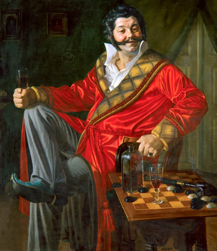 Герой картины "Завтрак аристократа" спускает все деньги, чтобы казаться успешным, и из-за транжирства он ест на завтрак простой хлеб. Абстрагируясь от юморной стороны этой замечательной картины, можно взглянуть на домашний наряд модника 19 века. Помимо самого халата мы видим феску и остроносые тапки. Фески и обувь были навеяны интересом к Востоку.