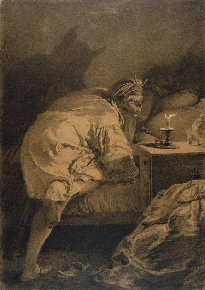 Мне попалась вот такая забавная картина. Мужчина перед сном задувает свечу, а рядом спит его жена.