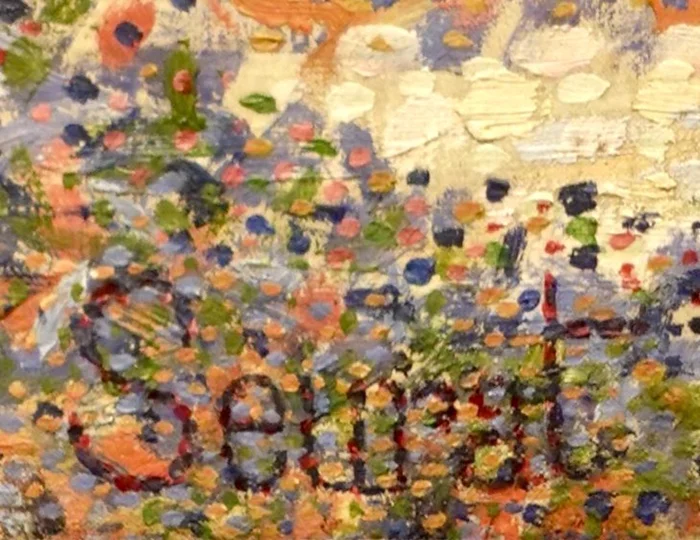 Ну вот, а теперь рассмотрим картину художника-постимпрессиониста Жоржа Сёрá «Воскресный день на острове Сен-Жатт». Мы выделили один её фрагмент красным прямоугольником: