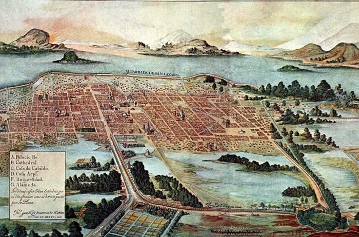 В 1325 году в долину Мехико пришло индейское племя ацтеков. Берега озера были уже заселены, поэтому для жилья ацтеки выбрали остров посреди озера Тескоко. Так возник город Теночтитлан, «озёрная столица» с бесчисленными каналами, мостами и насыпными дамбами. Через город протекали многочисленные реки – это было самое настоящее царство воды! Бернал Диас дель Кастильо, спутник знаменитого конкистадора Фернандо Кортеса, писал в своих дневниках о том, что городской рынок Теночтитлана был больше, лучше и чище, чем рынки Рима и Константинополя. Сложнейшая инженерная система дамб, каналов и шлюзов позволяла регулировать сток воды и защищала город от наводнений.