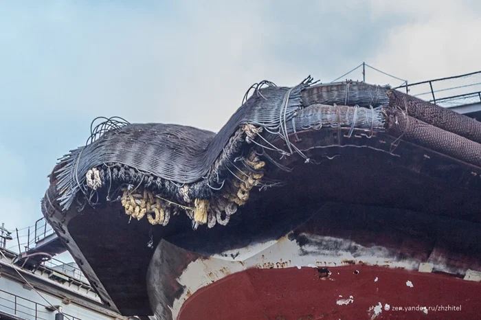 Спешу успокоить: это не вмятина и не повреждение, а специальная и очень нужная выемка. А нужна она для того, чтобы осуществлять специальный способ буксировки других судов, который называется «проводка на усах».