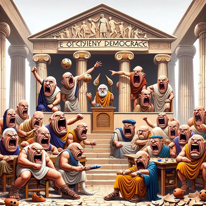 В какой-то момент демократия в Афинах дошла до абсурда. Греки стали выбирать членов Совета (античный парламент) с помощью случая, а не голосованием.