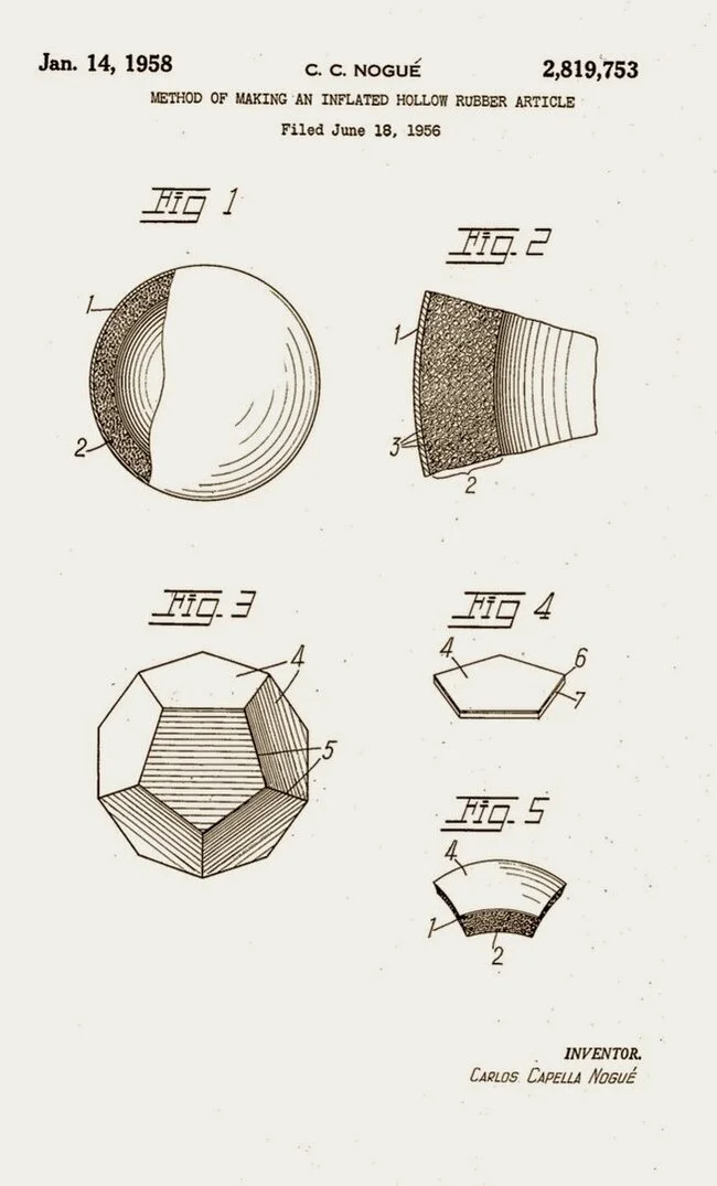 Из каучуковых листов вырезают лепестки пятиугольной формы. Закладывают в специальную обжимную машину, предварительно обрабатав стыки лепестков нашатырём и нитратом натрия. В машине лепестки обжимаются при высокой температуре. Каучук вулканизируется (при этом перестраивается его молекулярная решётка, и он превращался в резину), а нашатырь и нитрит натрия выделяют газ, который надувает мяч изнутри. Готово! И накачивать насосом воздух не нужно.