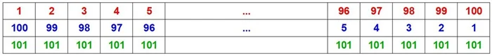 Сложим числа на верхней и нижней карточке «по столбцам». Смотрите! В каждом столбце у нас получается одно и то же число: сто один! Один плюс сто, два плюс девяносто девять, три плюс девяносто восемь – везде ровно сто один!