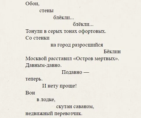 "На окнах висели темные коричневые занавеси с блямбами, и в квартире преобладали темно-коричневые тона. Над пианино висела репродукция картины Бёклина «Остров мертвых» в раме фантази темно-зеленого полированного дуба под стеклом. Один угол стекла давно вылетел, и обнаженная часть картины была так отделана мухами, что совершенно сливалась с рамой. Что творилось в этой части острова мертвых – узнать было уже невозможно".
