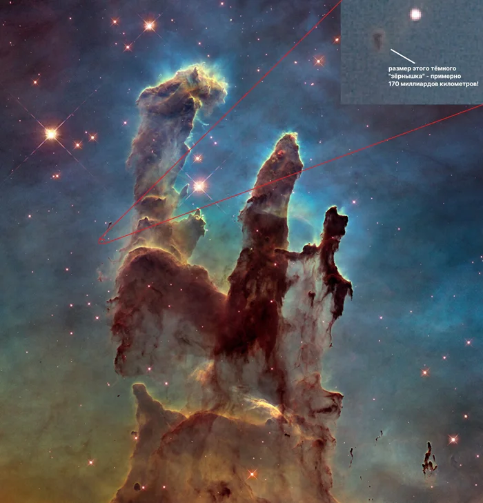 Внутри «пальцев» видны многочисленные «узелки», «уплотнения», «зёрнышки»; на обычных снимках они тёмные, почти чёрные, а вот в инфракрасном диапазоне видно, что внутри у них раскалённый до температуры в несколько тысяч градусов газ! Полным ходом идёт процесс сжатия, и уже совсем скоро внутри «зёрнышка» (на самом деле оно в несколько раз больше всей нашей Солнечной системы) «чиркнет» термоядерная спичка. Загорится новая звезда! «Столпы творения» – это даже не «звёздный детский сад», а самый настоящий «звёздный родильный дом»!