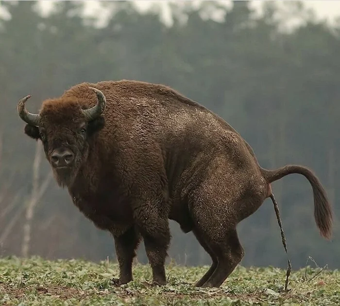 Просто художники, никогда зубров не видевшие, рисовали их "на слух". А что касается экскрементов... Да, есть у зубров и американских бизонов такая слабость (или сила?) – выталкивать продукты жизнедеятельности мощной струёй: