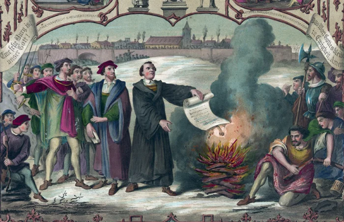 Мартин Лютер — немецкий христианский богослов и бывший католический священник. Будучи на службе у Ватикана, он пересмотрел свои взгляды на официальную церковь и отверг учение о высочайшем религиозном авторитете папы Римского. Лютер объявил несостоятельным католический догмат о том, что церковь и духовенство являются необходимыми посредниками между Богом и человеком. Он утверждал, что единственным путём спасения души для христианина является вера, дарованная ему непосредственно Богом. В 1517 году Лютер публично обнародовал свои 95 тезисов, что привело к различным восстаниям против церкви сначала в Германии, а затем и по всей Европе. В 1519 году Лютера вызвали на церковный суд, где потребовали публично отречься от своего учения, а после того, как тот отказался, папа Римский отлучил его от церкви. В ответ на это Лютер публично сжег отлучающую его папскую буллу и объявил, что борьба с папским засильем является делом всего немецкого народа.