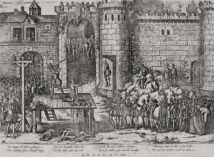 Группа гугенотов из дворянства в марте 1560 организовала Амбуазский заговор, в ходе которого планировалось захватить в плен короля Франциска II и вырвать власть из рук Гизов. Заговорщики не сильно скрывали свои планы, и вскоре слухи о заговоре дошли до королевского двора. Молодого короля перевезли в замок Амбуаз, который был способен обеспечить надежную охрану. 17 марта 1560 года заговорщики попытались взять замок штурмом, однако с треском провалились и были легко разбиты. В результате главарь заговорщиков Ла Реноди был четвертован, а около 1500 человек его "подчиненных" были казнены в присутствии короля. Их трупы были подвешены на железных крюках на стенах замка.