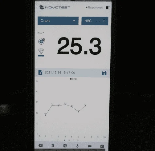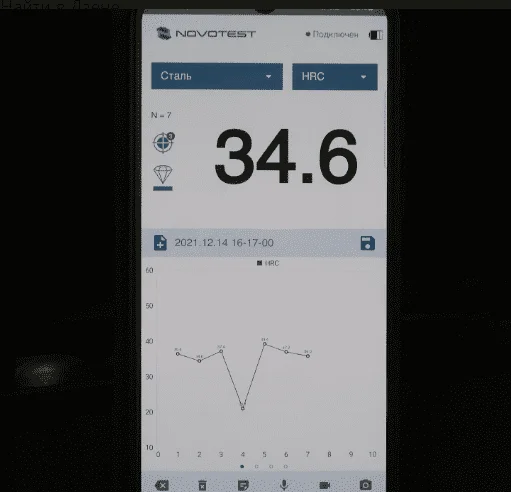 Теперь делаем 7 замеров и смотрим на средний показатель твёрдости по шкале HRC. И после получаем результат: разводной ключ - средняя твердость