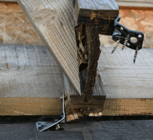 Поломало балки, вырвало дерево, загнуло оцинкованные уголки, но ни один саморез не лишился шляпки. Более того, нагрузка была настолько сильна, что саморезы гнуло и выдёргивало из дерева, но они выдержали.
