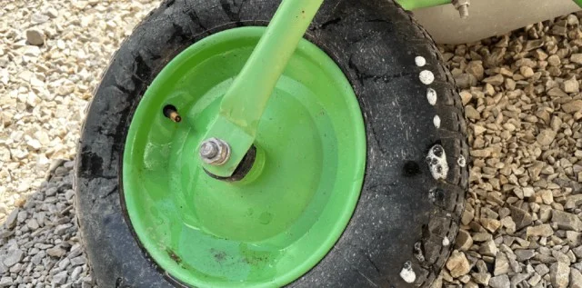 Прошла зима, я закупил саженцы, грунт и решил все это дело перевести от прицепа под навес при помощи тачки, естественно колесо сдулось и при накачке всплыла еще одна проблема - резина за зиму полностью рассохлась и внутрь попала вода.