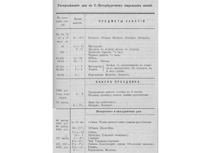 Из книги Ф. Радзиловской и Л. Орестовой «Мальцевская женская каторга 1907–1911 гг»: «Наш тюремный день начинался часов в 8 утра. Проверяли нас утром в 6 часов в то время, как мы спали. Надзиратель входил в камеру и считал издали количество тел на кроватях. Мы так к этому привыкли, что шум отпираемой двери не будил нас, и мы продолжали спать. Если бы вместо кого-либо из нас положили чучело, то утренняя поверка не могла бы этого выяснить. Обслуживала каждую камеру своя дежурная, причем дежурили по очереди. От дежурства освобождались только больные и слабые, к числу которых принадлежали Письменова, Езерская, Маруся Беневская, Окушко и др. На обязанности дежурных было — встать раньше других, убрать камеру, вынести парашу, разделить белый хлеб и поставить самовар. В тюрьме было два больших самовара; один “Борис”, названный по имени Моисеенко, другой “дядя”, присланный дядей Нади Терентьевой. Кроме того, было несколько сибирских “бродяжек”, напоминающих собой приплюснутый жестяный чайник, с ручкой и двумя отделениями — для воды и углей. Разжигается “бродяжка” так же, как самовар. Пользуются им, обычно, во время этапа в виду его портативности и большого удобства. Утренний чай пили по своим камерам. После чая дежурная мыла чайную посуду, и в камере водворялась тишина. Конституция, т. е. часы молчания, по взаимному соглашению устанавливались в камерах в утренние часы до обеда и в вечерние после того, как камеры запирались. В первое время камеры в Мальцевской были открыты целый день, и благодаря этому прогулка не была ограниченной. Летом даже почти все время до вечерней поверки проводили на дворе. Однако, постепенно эти льготы отменялись. В течение длительного периода, наиболее характерного для Мальцевской 1908–1910 гг., мы гуляли в определенные часы 2 раза в день по 2 часа, перед обедом и перед ужином. В остальное время дверь, отделявшая нас от коридора уголовных, запиралась, и мы проводили большую часть нашего времени в камерах или в коридоре, куда выходили наши общие камеры. Обед и ужин был у нас по звонку. Обедали мы в час дня, причем обед представлял собой очень интересную картину. Дежурные приносили обед, и все сходились в одну камеру. Ели, большей частью, стоя, наспех, так как не хватало сидячих мест. Позже этот порядок изменился, и обед стали разносить по камерам. Посуды также не хватало и мы, обыкновенно, объединялись по двое для еды супа. Объединение происходило не по дружбе, а по любви к соли. Были пары “соленые”, любившие здорово посолить суп, и «несоленые», объединявшиеся на почве нелюбви к соли. И это вошло в такую привычку, что когда прибавилось посуды, еще долго оставались “соленые” и “несоленые” пары. После обеда дежурные мыли посуду, подметали камеры и освобождались до ужина. Ужинали мы зимой в 6 часов, а летом в 7, так как летом камеры закрывались на час позже. После ужина в наш коридор, где в углу висела большая икона Николая чудотворца, приходили уголовные и пели молитвы. Для уголовных это было обязательным. Пропев свои молитвы, они расходились по своим камерам, а мы высыпали в коридор и устраивали здесь прогулку. Было очень людно, шумно и оживленно в эти последние минуты и особенно летом нам хотелось отдалить время закрытия камер. После поверки, производившейся по камерам, нас запирали, и вечерний чай мы пили уже в запертых камерах. Мытьем 