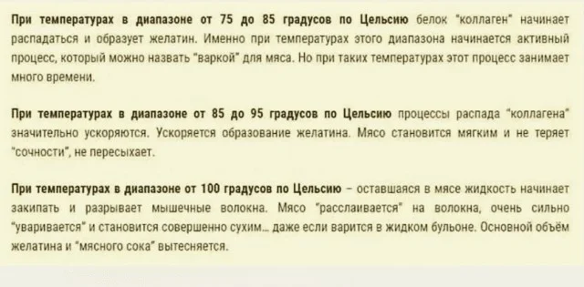 Далее я узнал у профессиональных поваров, что мясо действительно готовится при температуре бульона от 75 до 95 градусов. Так оно получается мягким и сочным. Что происходит с ним при активном кипении — смотрите ниже.