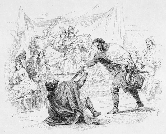 Кавгадый сдается Михаилу Ярославичу. За темником изображена плачущая Агафья.