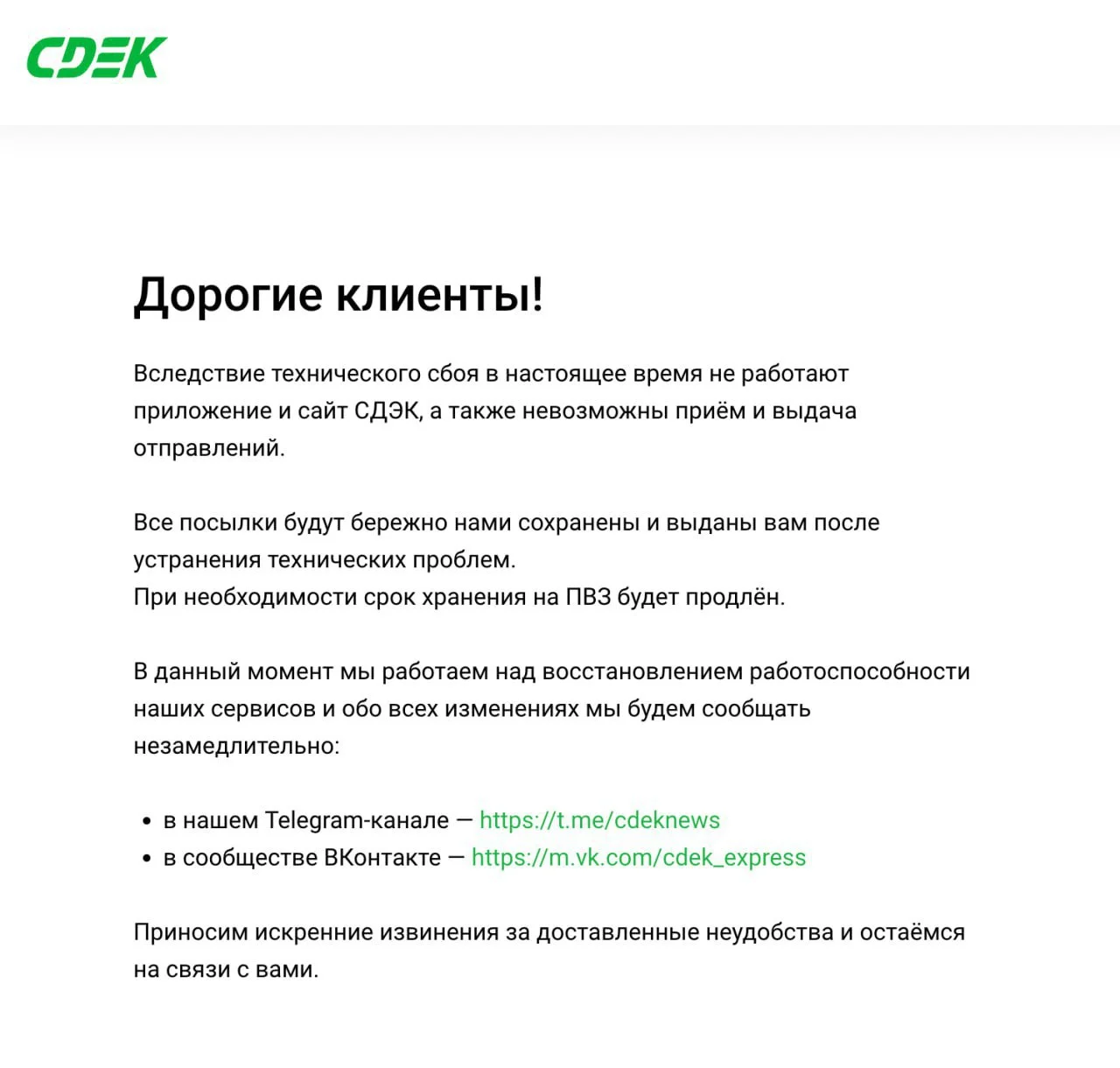 СДЭК намерен восстановить выдачу посылок не позднее 29 мая. Первый приоритет — восстановить работу пунктов выдачи.