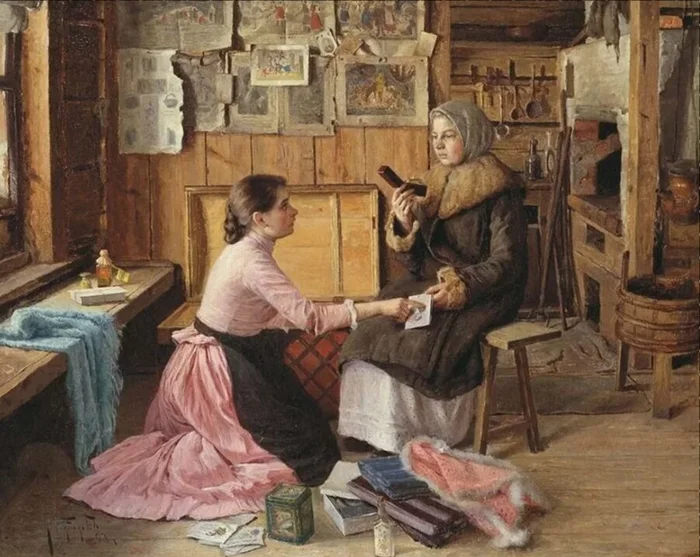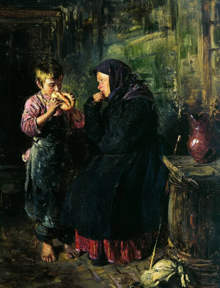 Крестьянка пришла навестить сына, которого отправили в город мальчиком или учеником в мастерскую. Эта работа сюжетом мне напоминает более известную картину В. Е. Маковского «Свидание».