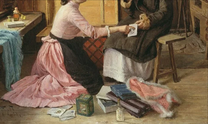 Эту картину часто подписывают как «Разговор у сундука», что только подпитывает интригу. Интерпретации встречаются разные. Нет даже однозначного ответа, кто из девушек приезжая.