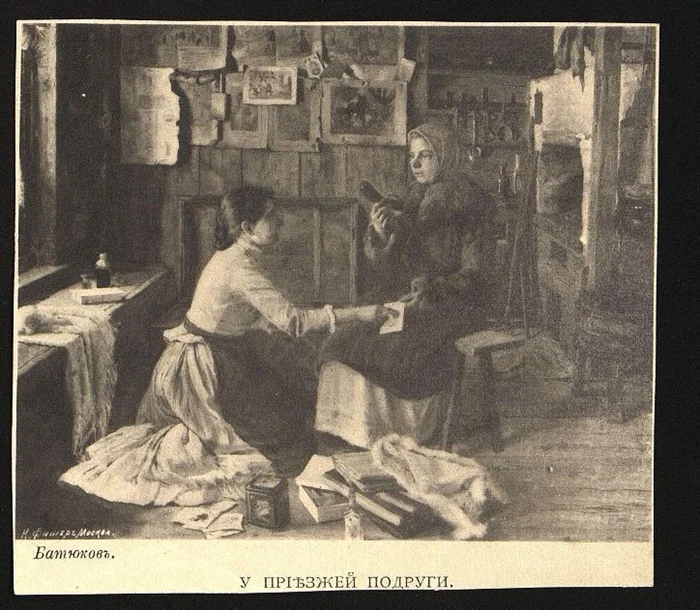По самой распространенной версии, у одной из девушек случился роман. В одной руке - фотокарточка, в другой - коробка с браслетом, на полу тоже фотографии, а еще на подоконнике связка писем и пузырьки с лекарствами. Да и лица у девушек какие-то не слишком радостные. У одной даже, скорее, унылое, а у другой встревоженное. Подозрительная история, да и только. Также на полу можно увидеть два отреза ткани, вероятно, на платья, и один белый, из подобного шили белье. «У приезжей подруги» - тот случай, когда нет единой трактовки сюжета, и каждый зритель может додумать историю самостоятельно. Сам художник пояснений не оставил (или они не дошли до наших дней). Возможно, он наоборот решил добавить интриги.