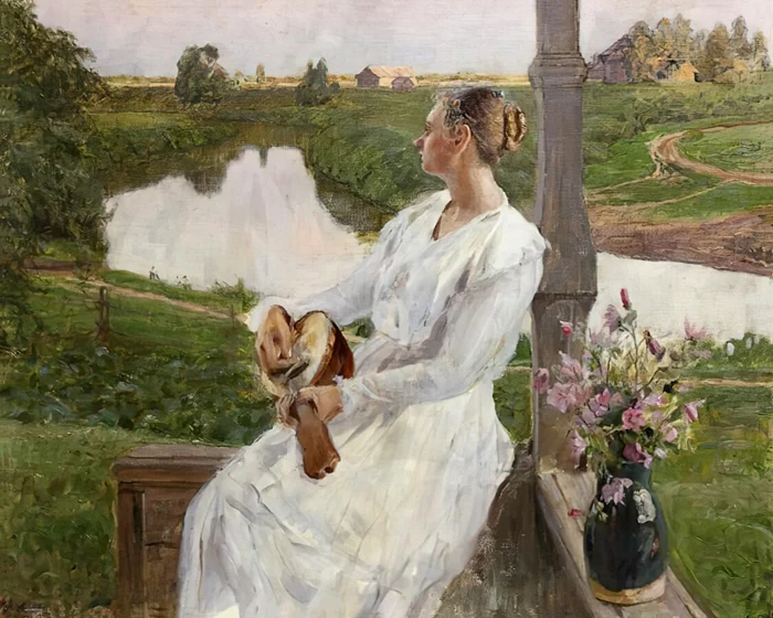 "Девушка на крыльце (Задумалась)". Холст, масло. 70х87. 1900-е. Ярославский художественный музей