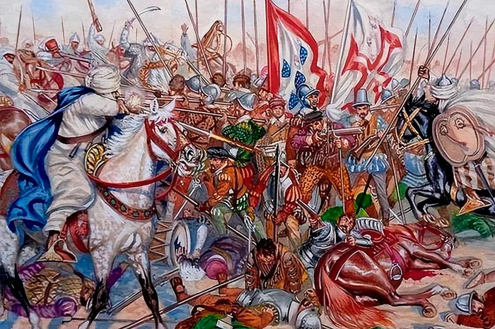 Конница Аль-Малика смяла фланги, а затем в дело вступила его пехота. Она состояла из андалузцев – потомков тех самых мавров, изгнанных с Пиренеев, которые, мягко скажем, не испытывали симпатий к португальцам. Со всей силой она ударила в португальский центр. Войско Себастьяна теснили с центра и охватили с флангов. Разношерстное португальское воинство, лишённое грамотного командования, не выдержало и побежало...