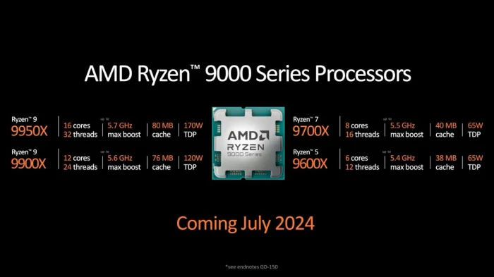 AMD выпустит свои первые процессоры Zen 5 для настольных ПК в июле, при этом флагман Ryzen 9 9950X возглавит рейтинг как «самый мощный в мире потребительский процессор для настольных ПК». Основанная на существующей платформе AMD AM5, новая серия процессоров Ryzen 9000 включает в себя Ryzen 9 9950X, Ryzen 9 9900X, Ryzen 7 9700X и Ryzen 5 9600X.