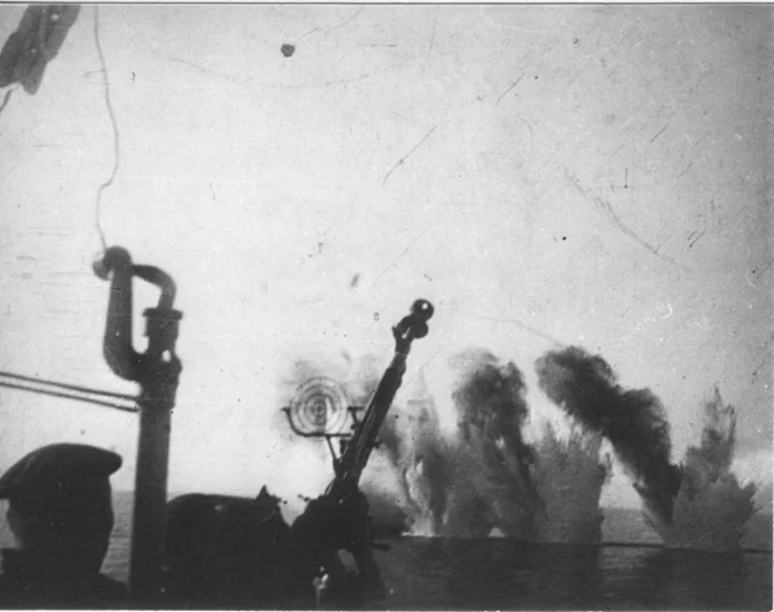 Зенитный пулемет «Ташкента» на фоне разрывов бомб