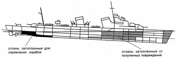 Фактически лидер медленно тонул. На центральном артиллерийском посту видели, как вода скрывает механизмы буквально на глазах. Эжекторы не справлялись с осушением. К борьбе за живучесть подключили пассажиров, старым дедовским методом по цепочке передавая ведра. Дыры в корпусе пытались заделать, чем угодно, даже матрасами. Дифферент на нос достиг 2,5 градусов и продолжал нарастать. Ход упал до 14 узлов (26 км/ч). В попытке выровнять нос пассажиров перевели с полубака на корму, стали выбрасывать за борт все нужное и не нужное, в качестве последней меры закачали в кормовые отсеки 200 тон забортной воды и только после этого сумели незначительно выровнять нос.