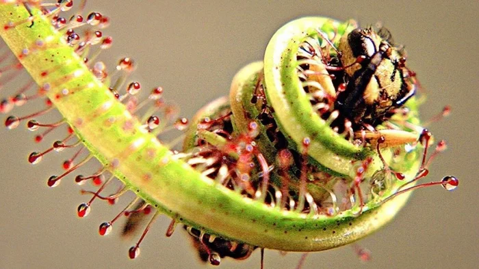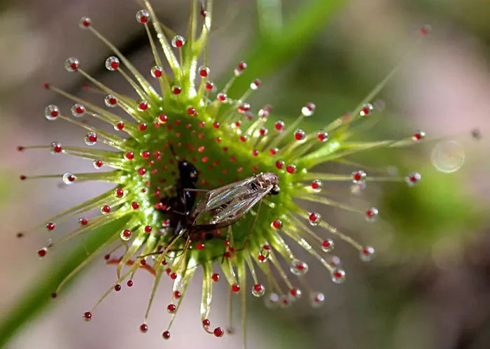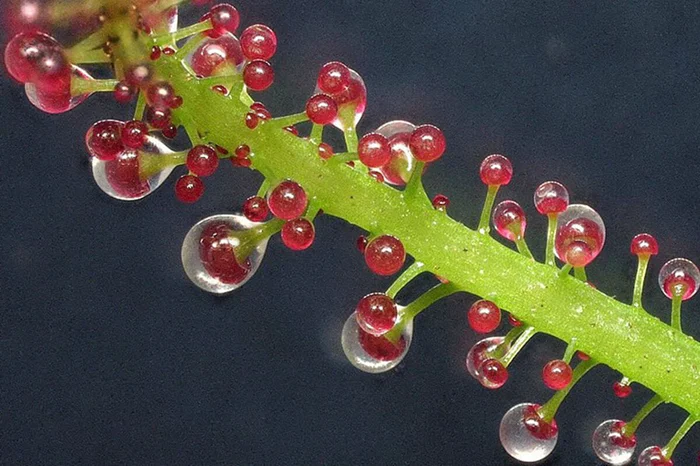 Липкие листья срабатывают как паутина. Опустившись на них, насекомое уже не может выбраться и постепенно поглощается растением.