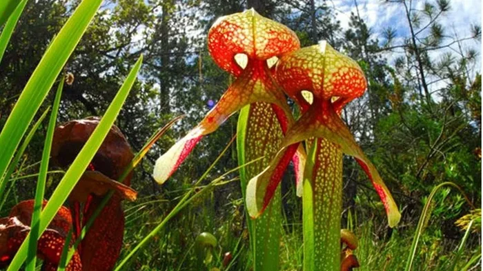 Настоящая кобра из мира флоры. Растет на небольшом участке суши, поэтому занесена в Международную Красную книгу. Ловушки растения похожи на капюшон, а раздвоенные красные выросты напоминают змеиный язык.