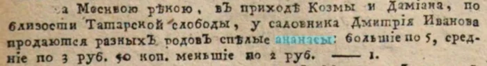 Наполеоновские войска, вошедшие в 1812 г. в Москву с удивлением закусывали, найденными в местных теплицах ананасами, вино. Масштабы увлечения России ананасами стали промышленными, и фрукты стали экспортироваться в Европу. Ежегодно вывозилось несколько сот пудов «русских» ананасов (иные источники пишут о тысячах пудов).