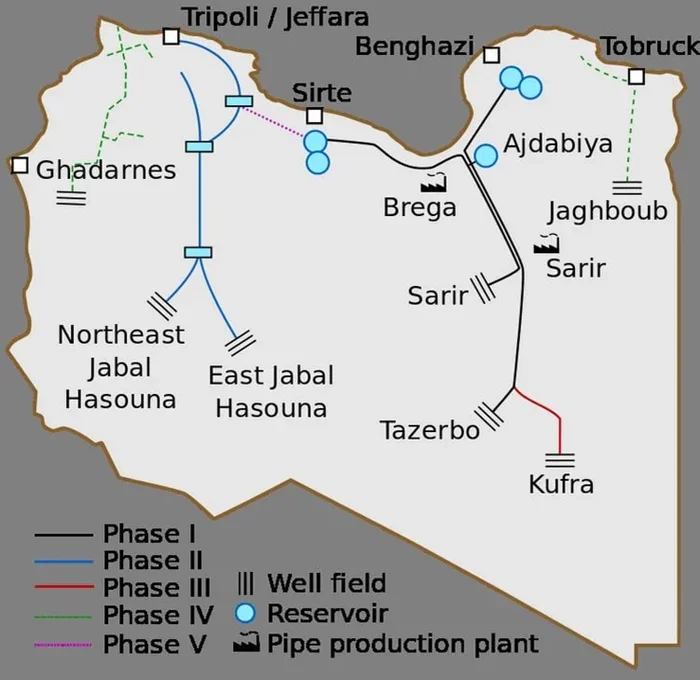Проект развивался, охватывая всё новые регионы. Вторая фаза, начавшаяся в 1991 году, тянула водные пути к Триполи и другим прибрежным городам. К 2000-м годам третья фаза расширила сети в центральные и южные части страны.