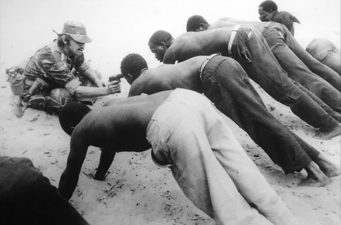 На фото белый военный из состава Вооруженных сил Родезии (сейчас территория Зимбабве) прокачивает допрашивает повстанцев в полуденную жару пустыни Калахари на границе Родезии с Ботсваной, 21 сентября, 1977 года.