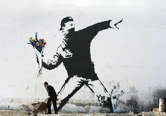 Однажды Бэнкси решил получить копирайт на свое изображение протестующего, бросающего цветы. Но соответствующее ведомство отказало ему под предлогом того, что он не собираеся продавать свою работу, и напомнило ему его собственные слова: "Копирайт - для лузеров".