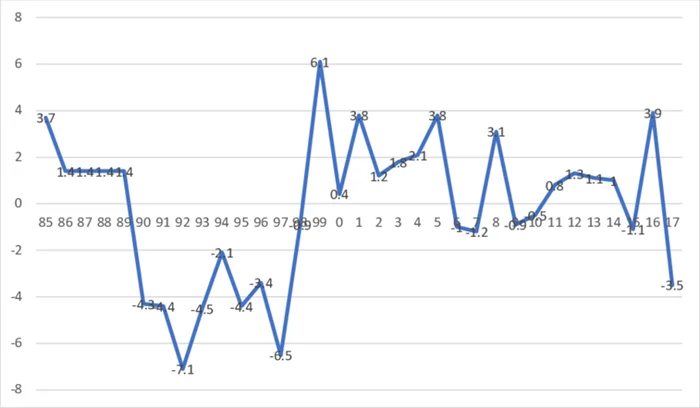 Рост ВВП Северной Кореи с 1985 по 2017 годы, в %