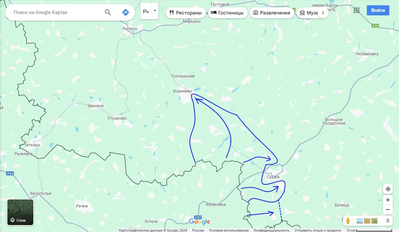 Причем, все говорит о том, что Суджа для противника не является приоритетной целью. Главная задача для него очевидно лежит на севере (Коренево). И именно движению туда он прилагает куда больше усилий.