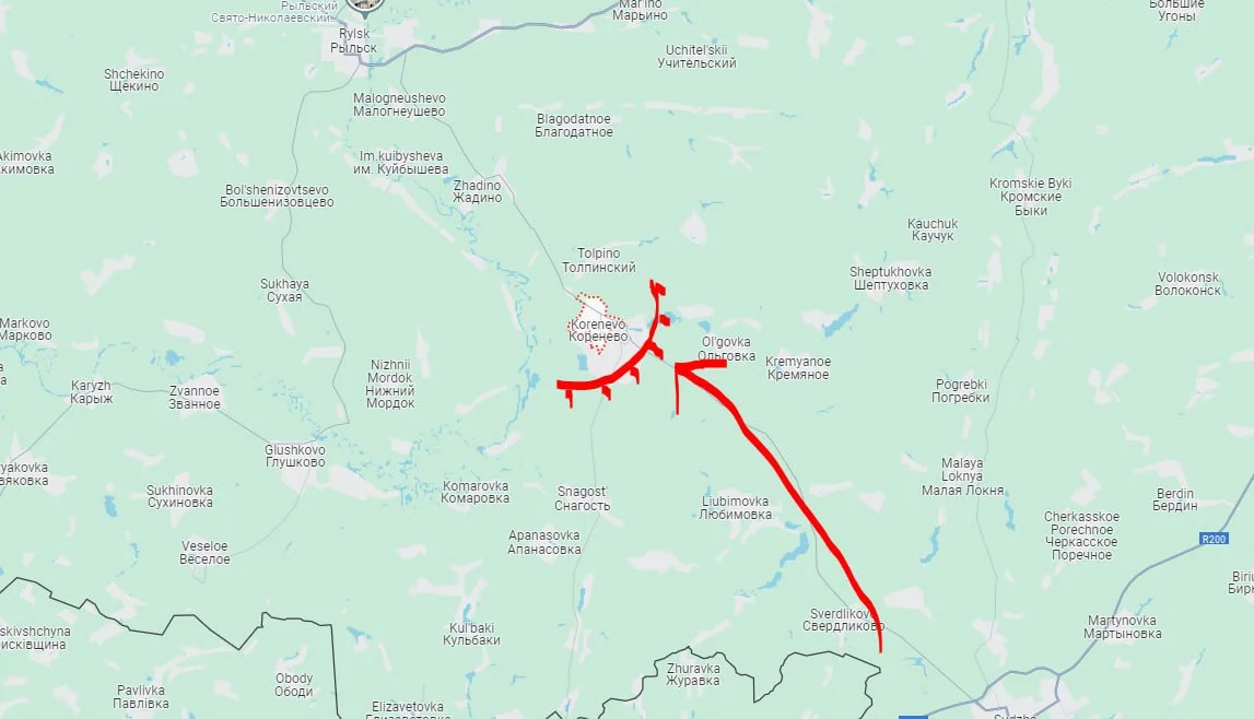 Причем, косвенная информация говорит о том, что, как мы и предполагали днем, Коренево для противника является только промежуточной целью по дороге к Рыльску. На который ВСУ могут наступать сразу с двух направлений.