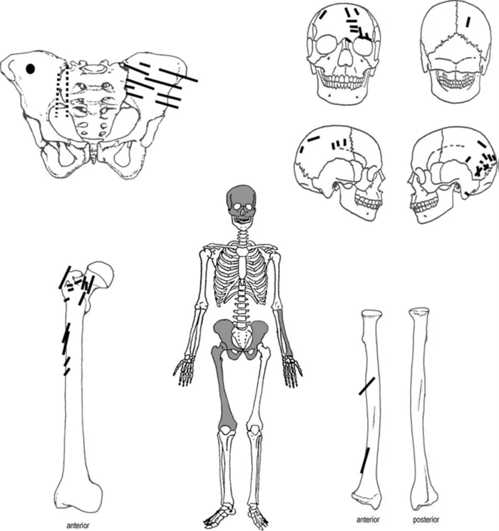 Количество травм очень специфично – на 12 мужчин было нанесено 25 ударов суммарно, а на 7 женщин приходилось 52 раны (!), в 2 раза больше. Удельная разница и вовсе была трехкратной на одного мужчину приходилось в среднем 2 удара, а на женщину 7,4. Травмы мужчин концентрировались преимущественно на передней стороне скелета, все это порезы клинком.