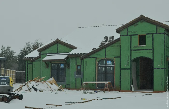 Процесс обшивки и подготовки дома к кладке снаружи. Кстати, на дворе воскресенье, никого нет, но везде лежит инструмент и материалы, стоит техника. Почему - я уже объяснял ранее.