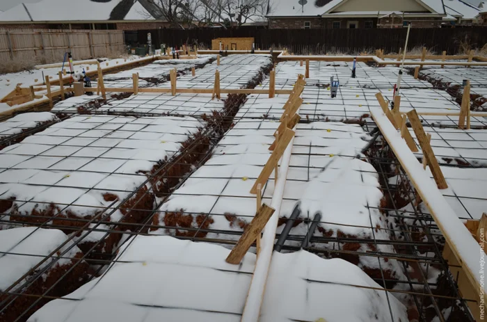 Первым делом заливают фундамент. Делается также обычный монолитный фундамент. Растягивается арматура, укладываются коммуникации, после чего заливается бетон. Первое отличие, которое присутствует тут, в сравнении с Хьюстоном - утепление труб. Грунт промерзает в этих штатах примерно на 20-30 см, поэтому все коммуникации утеплены, как в земле, так и внутри самого дома. Для утеплителя обычно используют резиновые утеплители со значением R равным 3-4, в горных штатах - 5.
