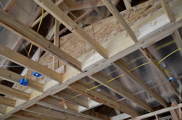 В доме укладывается двойное утепление, под самой крышей и, затем, между крышей и потолком. В Хьюстоне утепление на самой крыше отсутствует, есть лишь утепление между чердаком и потолком. Под крышу зашивают листовые утеплители, с идентичными значениями R, что я упоминал выше. Такими же листами обшивают потолок со стороны чердака. Затем на эти обшитые листы набрасывают слой минеральной (каменной) ваты, толщиной около метра.