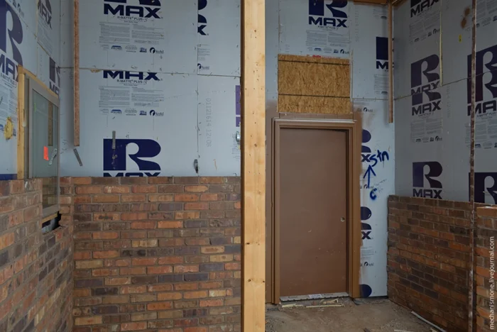 Затем их обшивают утеплителем. Здесь строители используют панели Rmax R-Matte 3. После чего стена обкладывается кирпичной кладкой в половину кирпича. Между стеной и кладкой оставляют отдушину для циркуляции воздуха. Эта же отдушина служит утеплителем. В этих условиях такого утепления достаточно, чтобы стены не промерзали, и дом отлично сохранял тепло.
