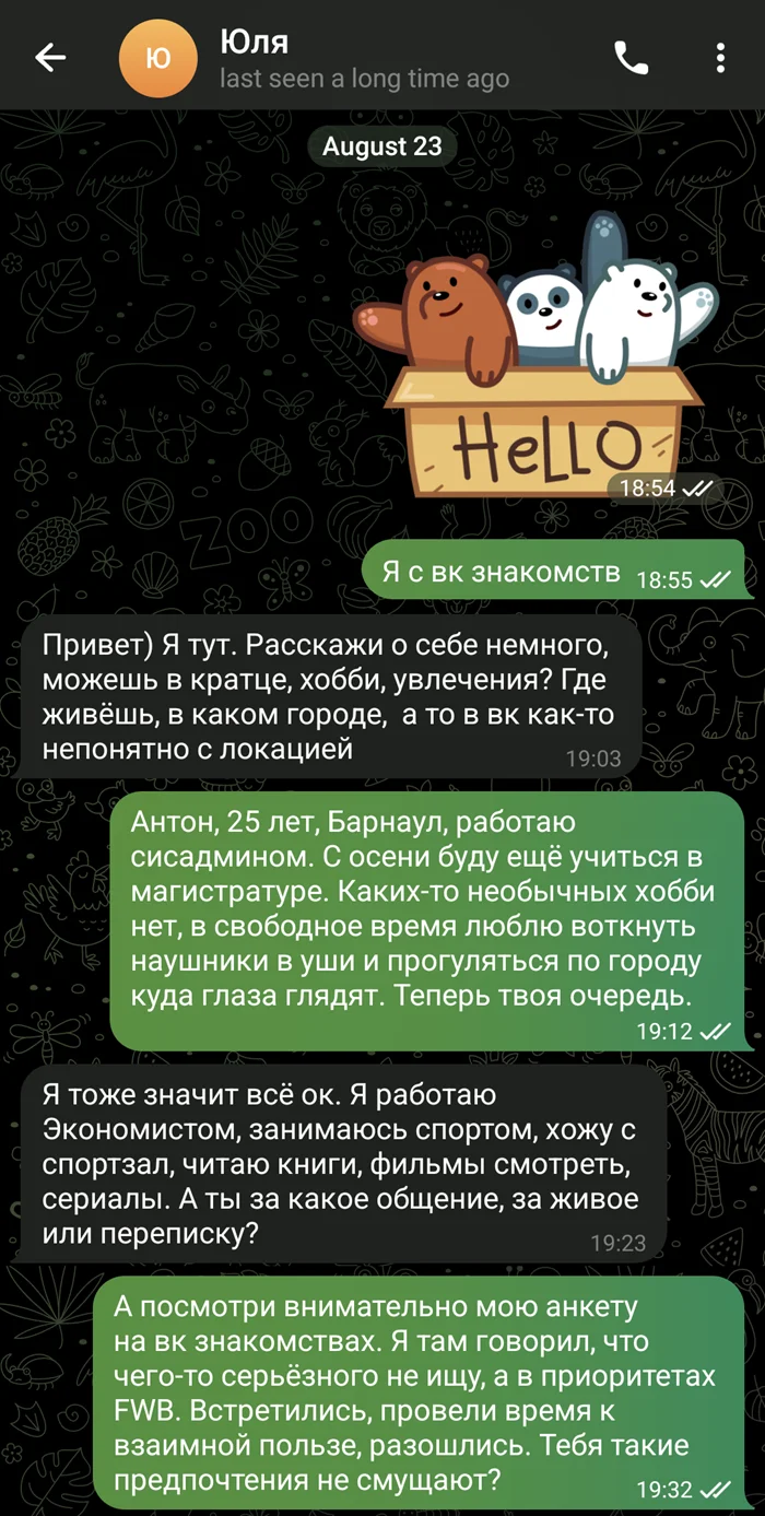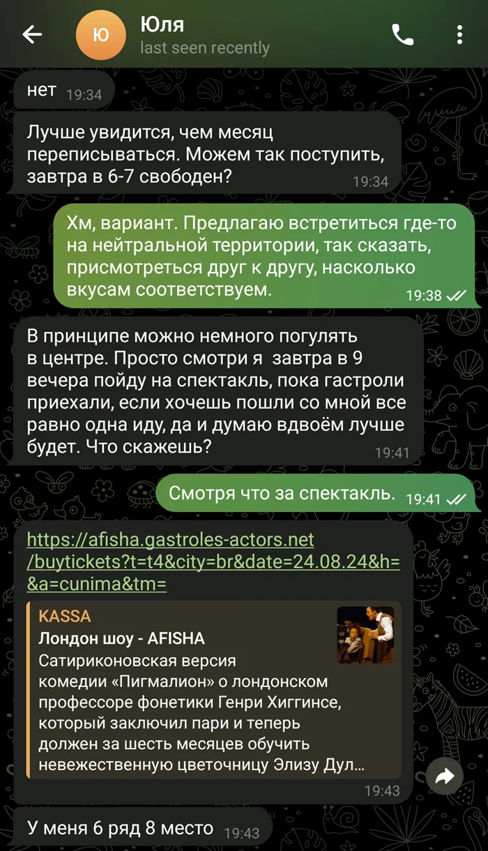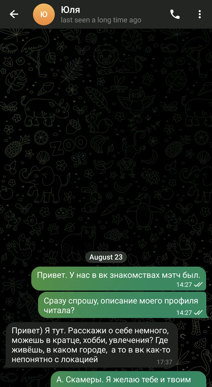 Объясняю что тут произошло. Вопрос "в вк глючит локация, в каком городе живёшь" - это огромный красный флаг подводки к скам-схеме. Скамеры массово ставят лайки с кучи аккаунтов из разных городов, и сразу уточняют в каком из них попалась потенциальная жертва. Я немного расстроился из-за того, что меня так банально попытались развести, поэтому сразу ответил, где я видел их попытки развода. Но через некоторое время подумал, почему бы им не подпортить жизнь немного? Беру другой аккаунт телеграма и пишу по тому же адресу.