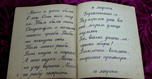 Это сегодня учёные разобрались в том, что мелкая моторика влияет на развитие мышления и мозга ребёнка, а в советское время это делалось «на интуиции». Зато как приятно посмотреть на рукописные тексты тех учеников! У большинства из них эта красота почерка сохранилась и поныне. А вот у последующих поколений детей полностью утрачено искусство красивого письма, да и прибавилось проблем со здоровьем, особенно со зрением и осанкой.